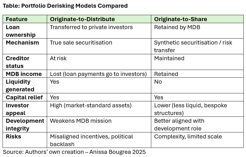 In short: both models present trade-offs. Originate-to-distribute is more attractive to capital markets but risks hollowing out MDBs’ development function. Originate-to-share is safer for preserving MDBs’ public mandate, but faces structural and political limits to scale.